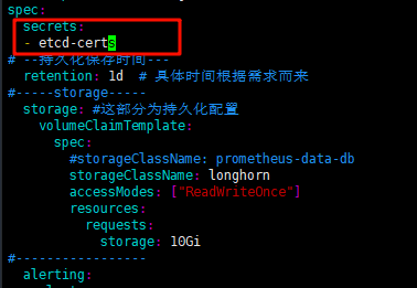 etcd默认是有证书的,所以需要提前将etcd的证书创建成secret,并且挂载到prometheus的pod中去。