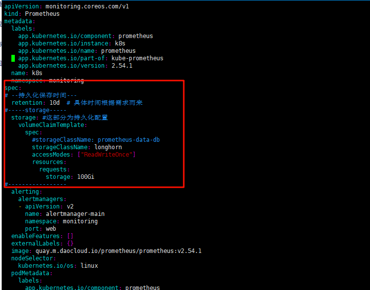 由于默认情况下prometheus的数据是存储在pod里面,当pod重启后,数据就丢失了,这不利于我们分析长期数据,所以需要将数据存储到之前搭建的longhorn中。