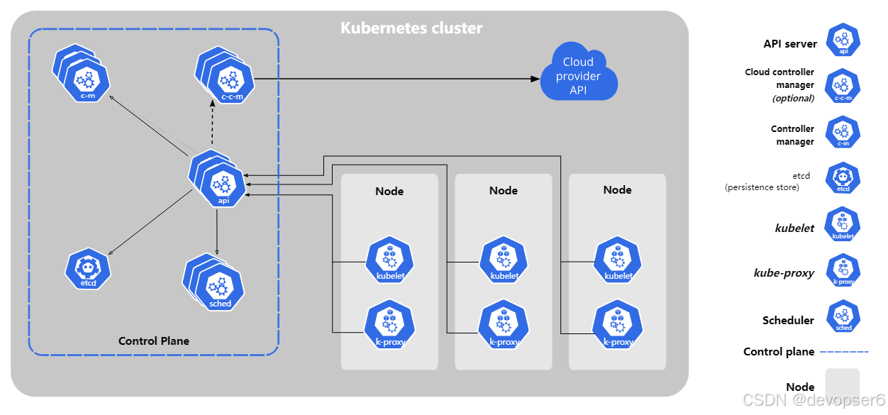 Kubernetes 集群由控制平面和一个或多个工作节点组成。以下是主要组件的简要概述: