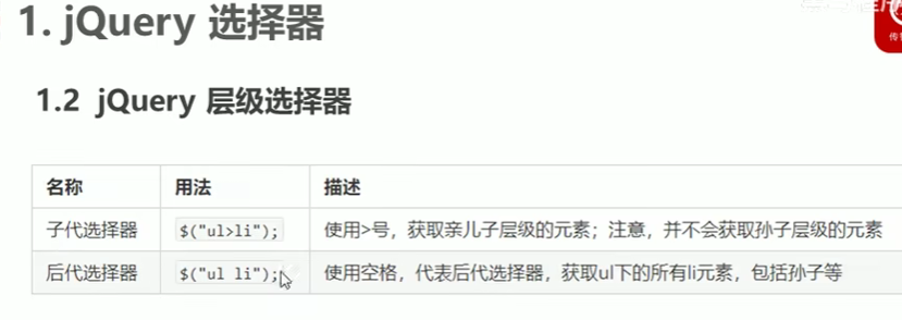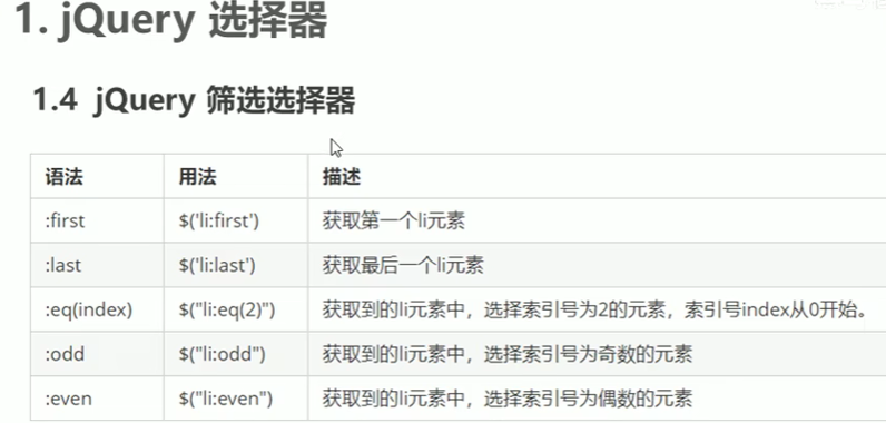 // : even $("li:even") 获取到的i元素中,选择索引号为偶数的元素