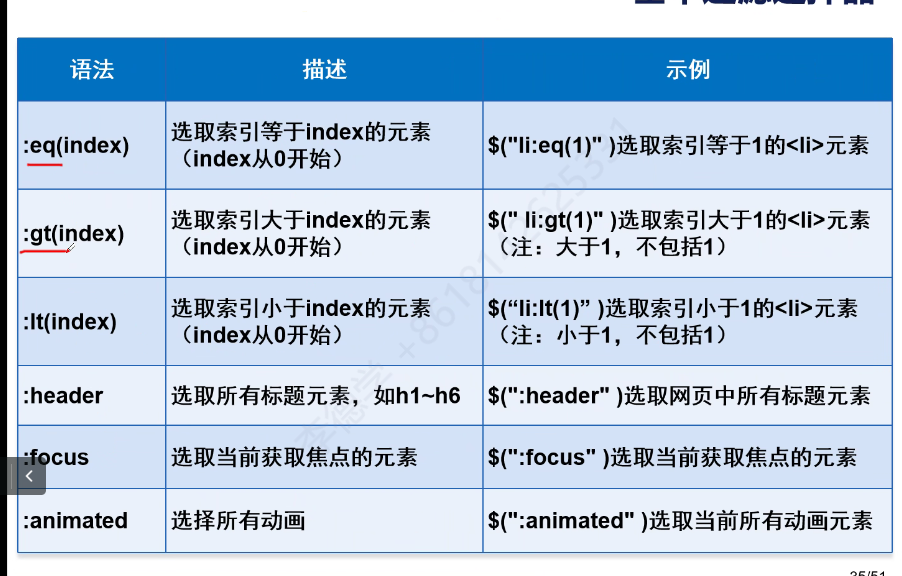 // : eq(index) $("li:eq(2)") 获取到的1i元素中,选择索引号为2的元素,引号index从0开始。