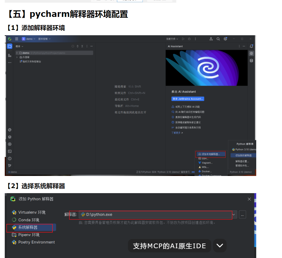 添加电脑上D盘已安装好的python解释器方法。主要是找到-系统解释器python.exe这个文件件