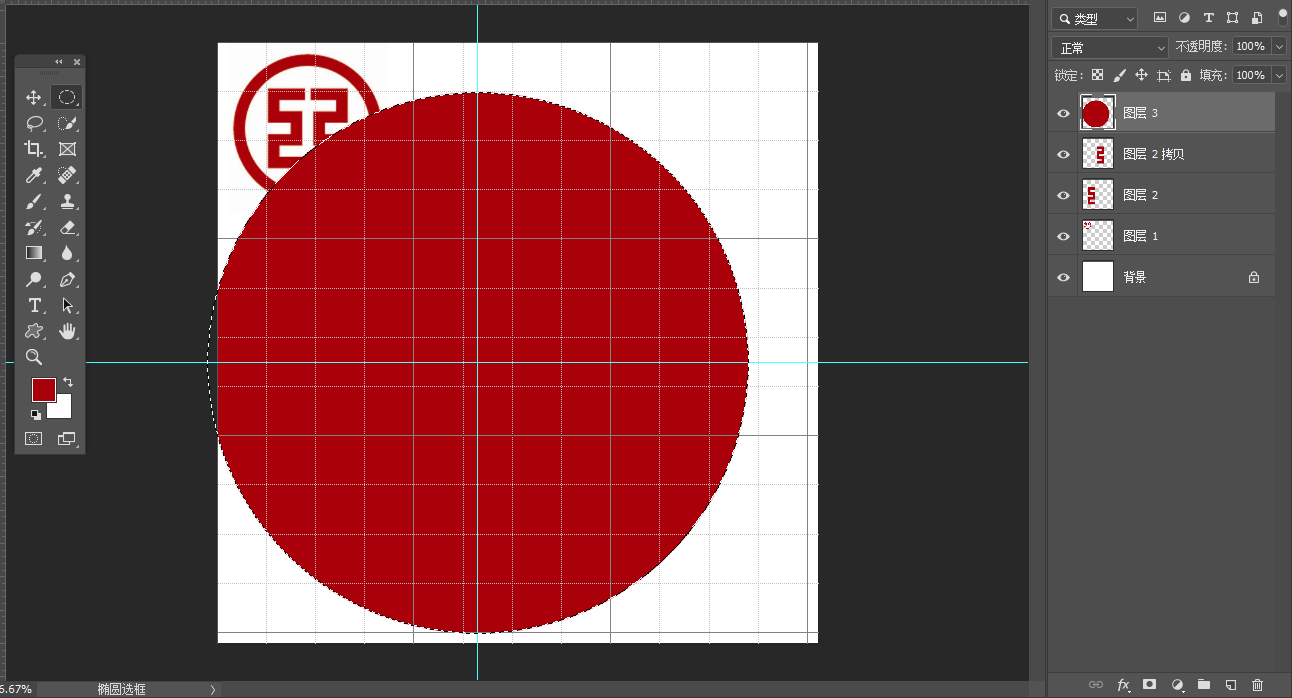 6.将标尺拖拽到中心位置,形成一个十字,以此为中心画⚪。alt+shift 鼠标从中心位置向外拖拽。然后新建图层,alt+delete填充颜色。