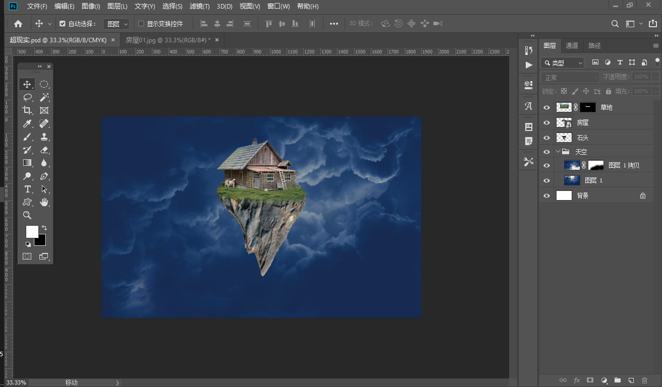 该案例为超现实的图片制作。先是从天空开始,为了遮蔽原图中的较白的部分,将图层复制添加图层模板,然后在将房屋拖拽过来,最后给房屋前添加草地,