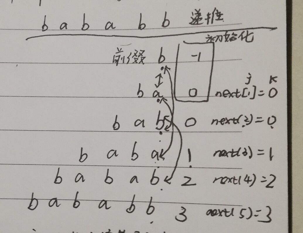 对模式串p求next数组,next数组的值为模式串p的该位置失配,下一步j从哪个位置回溯。