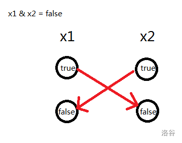我们发现,从 \(x_1\) 的 false 出发会走到 \(x_1\) 的 true ,也就是说 \(x_1\) 现在只能等于 true 了;同理从 \(x_2\) 的 true 出发能走到 \(x_2\) 的 flase,说明 \(x_2\) 只能等于 flase;