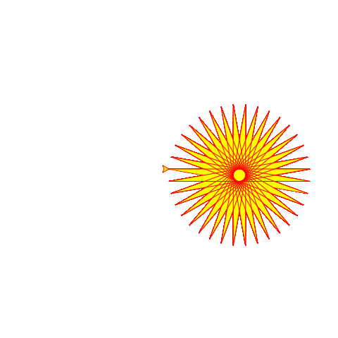 from turtle import * color('red', 'yellow') begin_fill() while True: forward(200) right(170) if abs(pos()) < 1: break end_fill() done()