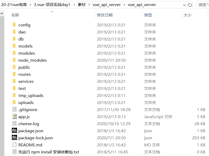 3 进入C:\Users\Lenovo\Desktop\project\20-21vue电商\3.vue-项目实战day1\素材\vue_api_server\vue_api_server (这个就是后台项目,第一次使用要npm install安装依赖包)