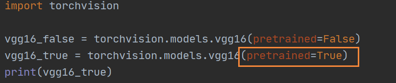 vgg16模型,pretrained = True就是直接拿训练好的模型过来,参数都是训练好的参数,他这里默认在是mageNet中训练的,把图片分成了1000类。