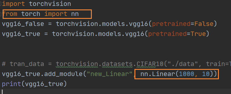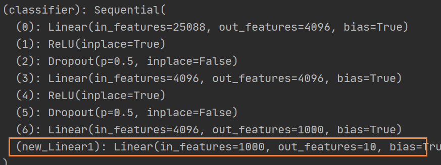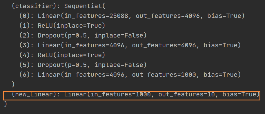 vgg16_true.classifier.add_module("new_Linear1", nn.Linear(1000, 10))