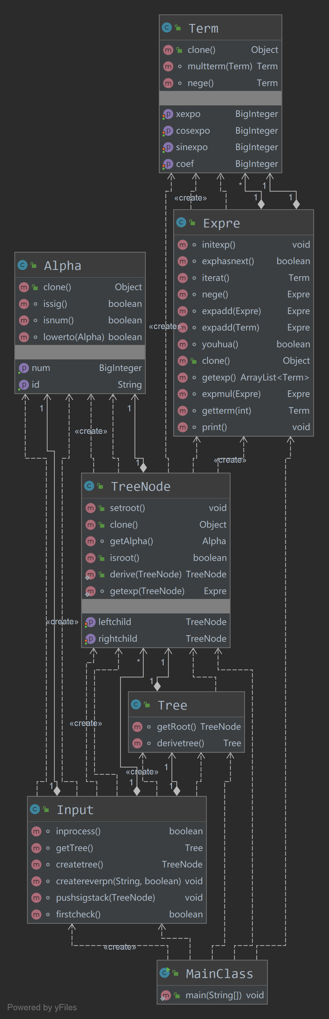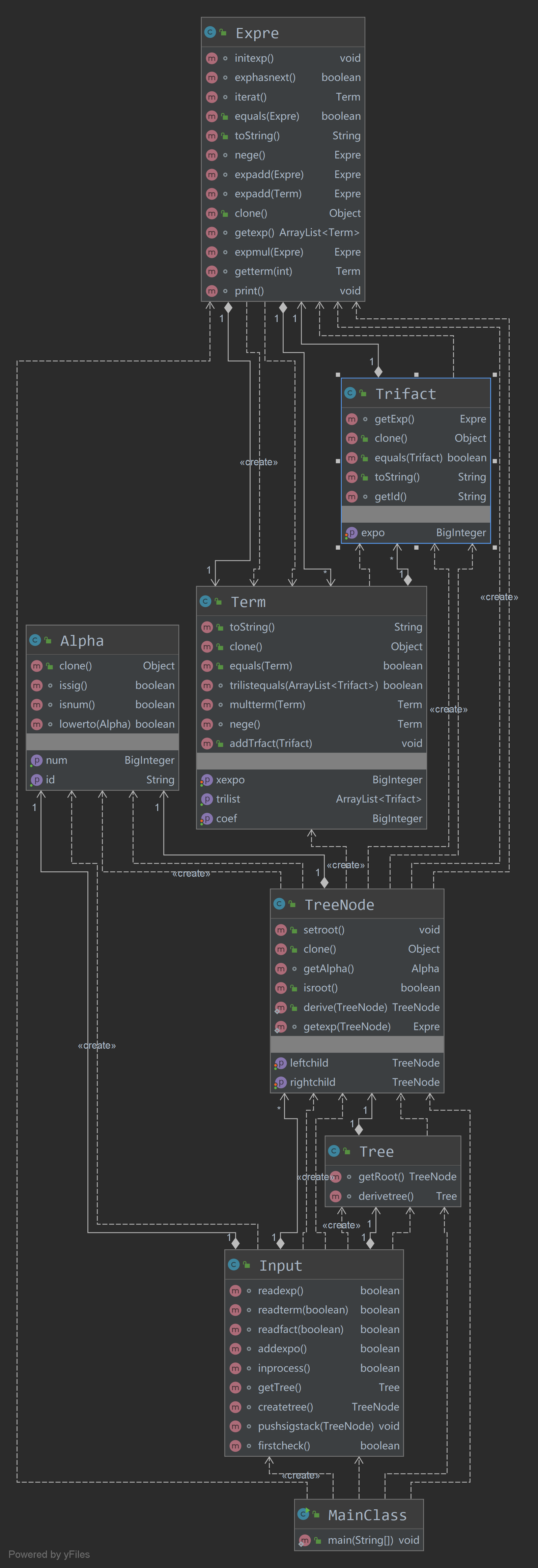 本次作业不再是简单只含有x,无论是输入处理还是求导都变得更加复杂,在这样的情形下必须使用表达式树进行处理;在输入的处理上本次放弃了使用大正则表达式,而是使用了分割+小正则表达式的形式,将整个表达式通过+-分割成不同的项,每一项使用正则表达式判断是否符合格式,然后提取必要信息。由于第一次作业并未考虑到这样的后续的可扩展性,导致了第二次作业整个重构,最后时间不够中测未通过。
