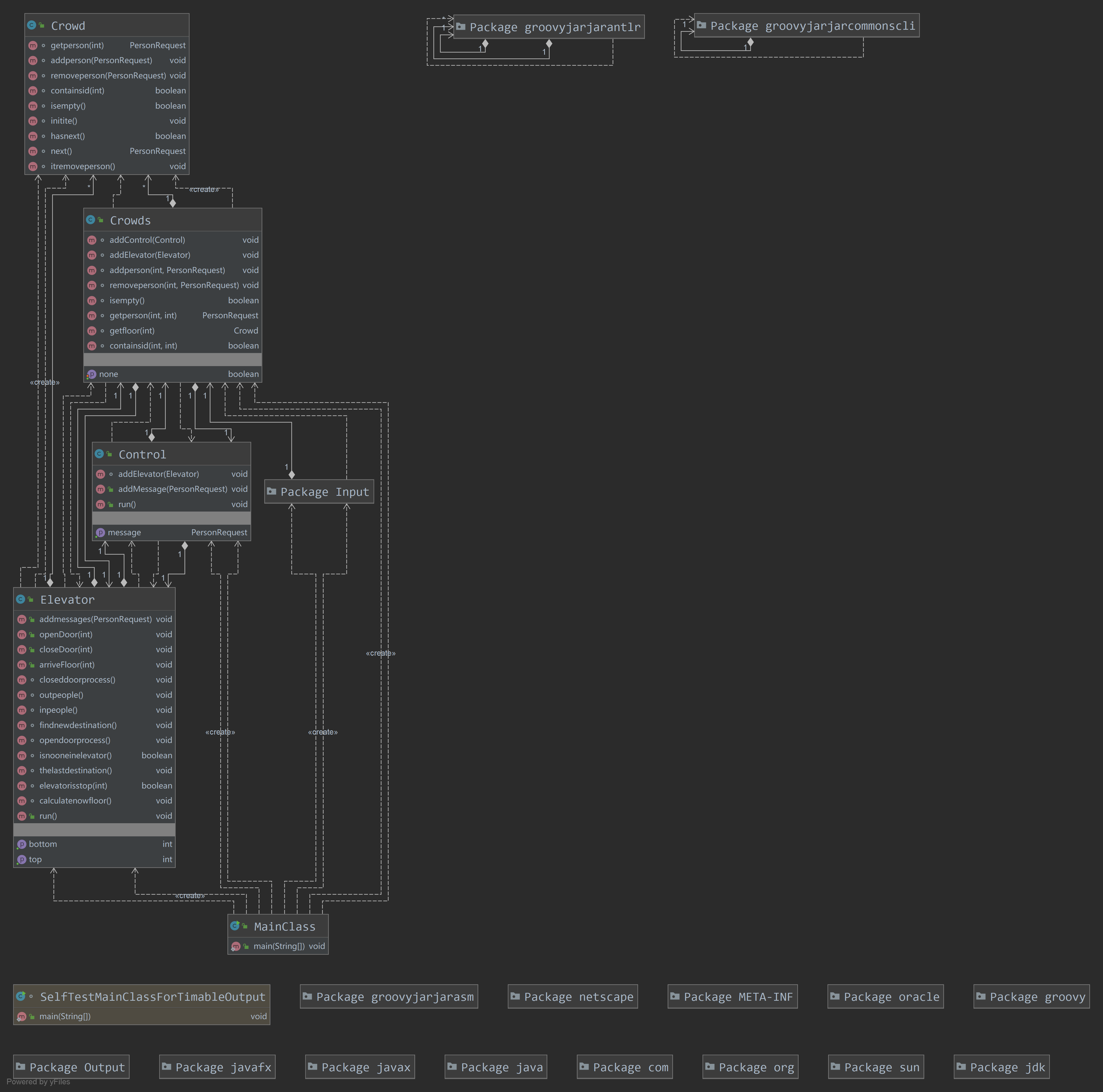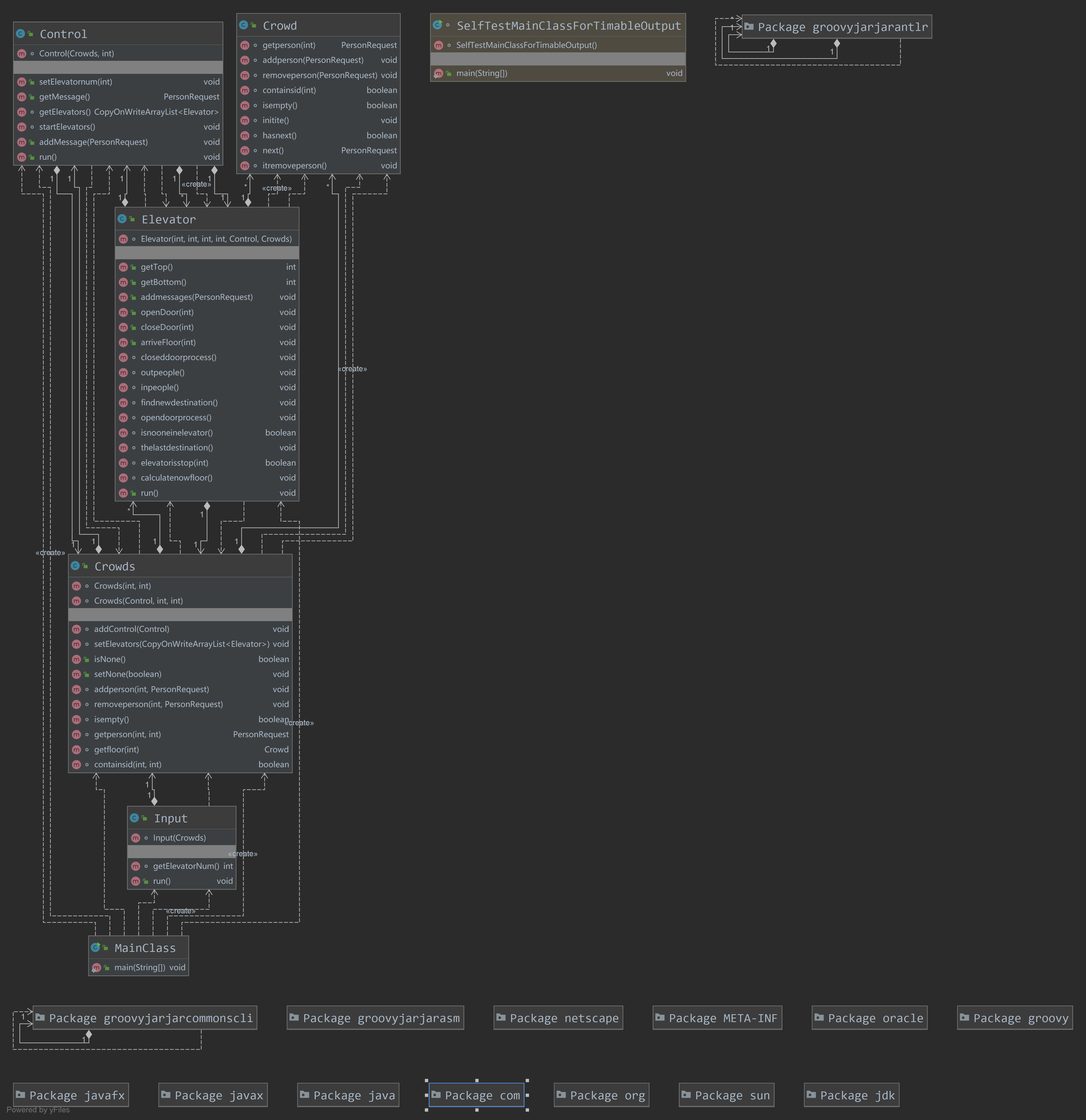 在第一次作业时完成了整个单元的架构设计,后续两次作业均未做出大的修改。模拟一个“真实”的楼层,这个楼层是一个请求的容器,对所有电梯均可见,有请求发出便将请求放置在请求出发地,电梯到达该楼层时将该请求放入电梯并从楼层中删去此请求。这样设计后对于电梯来说就没有了“捎带”这个概念,电梯只要往复的上下楼,遇到有人出电梯或进电梯便停下。另外在考虑到后续多电梯的情况设计了“control”类,本意为中央控制器,负责调度所有电梯,因为本次作业中只有一个电梯,所以control几乎没有实质性的工作。由于设计时间花费时间过长且第一次实现多线程,对很多问题理解不够透彻,导致未能按时提交作业。