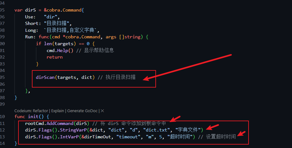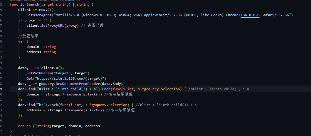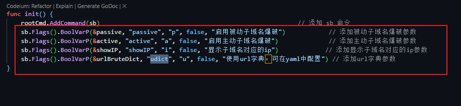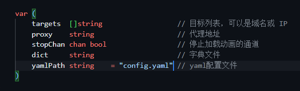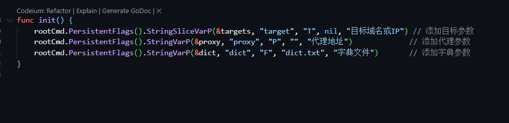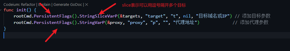 这里先告诉各位师傅我存了两个全局参数在root.go中,target是通用的,proxy也是通用的,同时target目标可以用逗号分隔开作为多个目标传递,因为我使用了StringSliceVarP函数接收参数,OK交代完毕。