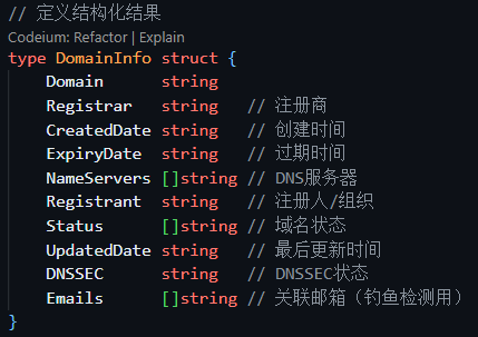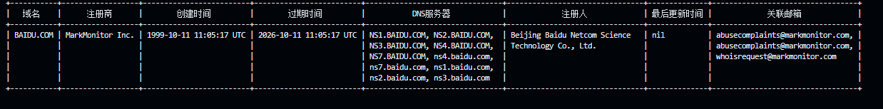 但是whois返回的是整个查询结果的原生字符串,所以只能够自己写正则匹配来提取内容了