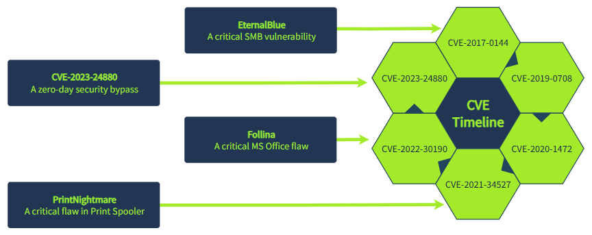 一旦漏洞被公开,就会被分配一个通用漏洞披露 ( CVE ) 编号。从那时起,一场争分夺秒的竞赛就开始了:攻击者开发漏洞利用程序,而防御者则争分夺秒地更新系统。以下是 Windows 漏洞每年演变的详细时间线:
