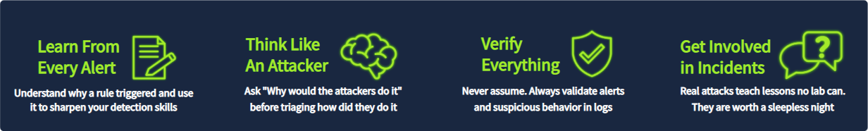 - 积极主动,尝试参加 CTF 比赛,关注网络安全新闻,并考虑考取 SAL1 认证: https://tryhackme.com/certification/security-analyst-level-1!