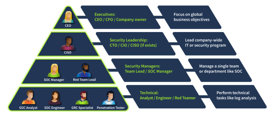 从上图可以看出,像首席执行官这样的高层管理者通常专注于全球业务目标,而不负责技术方面的管理。因此,他们会聘请首席信息安全官(CISO)或类似职位,由了解业务需求并能组建最合适的安全部门的人员来负责。
