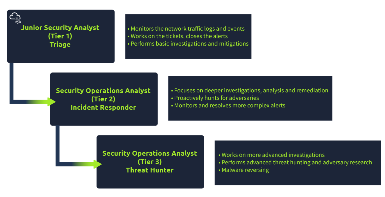 随着您作为初级安全分析师的进步和技能的提高,您最终将晋升至第 2 级和第 3 级。