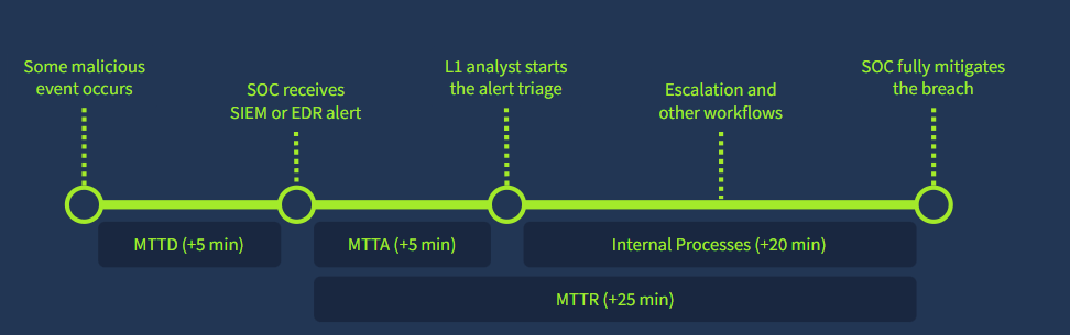 其次,请记住,警报本身并不能阻止安全漏洞的发生,因此及时接收警报、进行优先级排序并在攻击者达到目的之前做出响应至关重要。确保快速检测和修复威胁的要求通常会被纳入服务级别协议 ( SLA ) 中——这是一份由内部安全运营中心(SOC ) 团队与其公司管理层之间,或由托管安全运营中心 (MSSP) 提供商与其客户之间签署的文件。该协议通常要求快速检测威胁(以平均检测时间 ( MTTD )衡量)、一级分析师及时确认警报(以平均响应时间 ( MTTA ) 衡量),以及最终对威胁做出快速响应,例如隔离设备或保护被入侵的帐户(以平均修复时间 ( MTTR ) 衡量)。