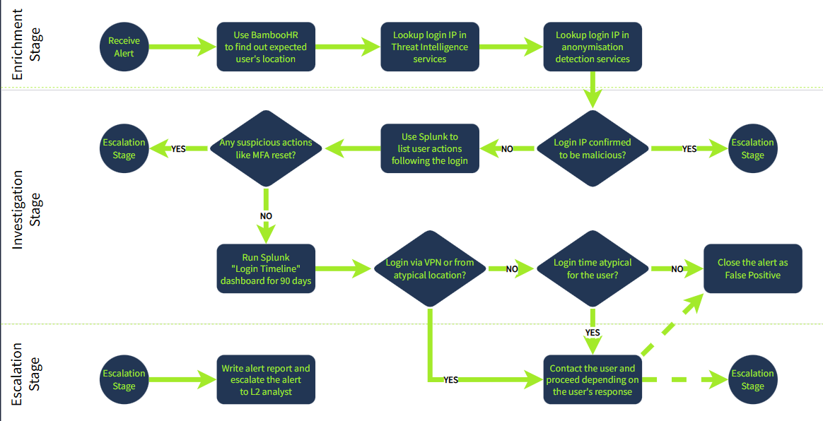 这是最复杂的一步,需要您运用技术知识和经验来理解活动,并在SIEM或EDR日志中正确分析其合法性。为了帮助一级分析师完成这一步骤,一些团队会开发工作簿(也称为剧本或运行手册)——其中包含如何调查特定类别警报的说明。如果没有工作簿,以下是一些关键建议: