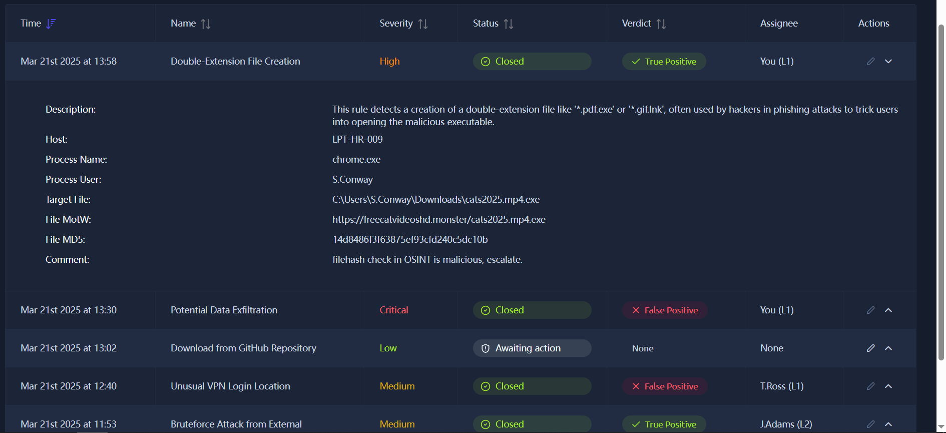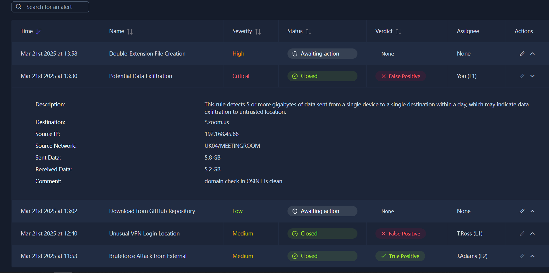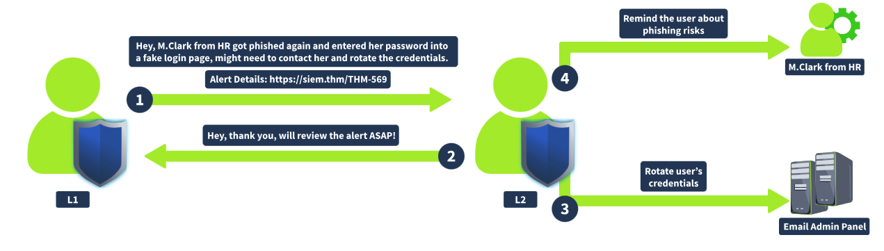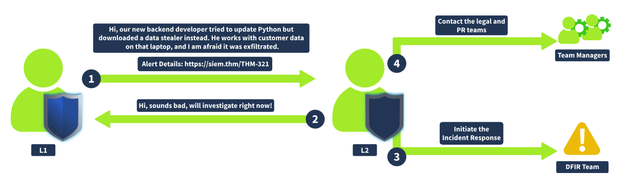 - SOC L1 分析师: 审核警报,区分真假,并在发现真实威胁时通知 L2 分析师。