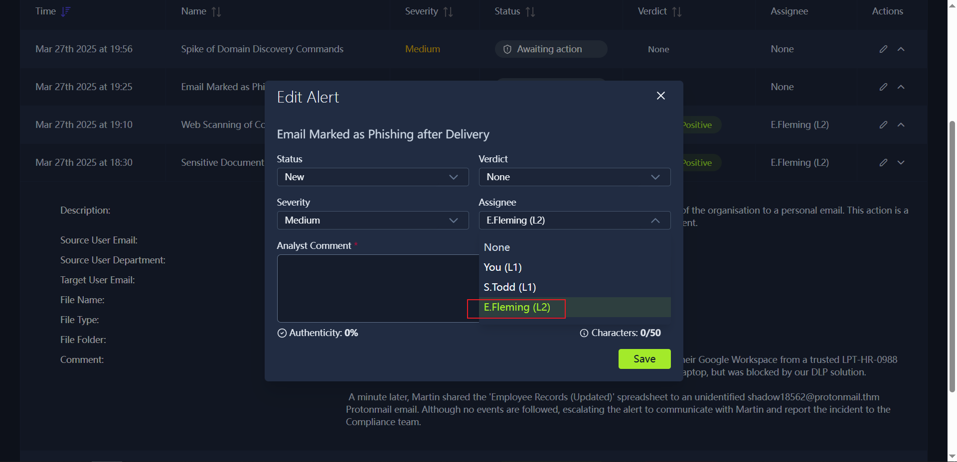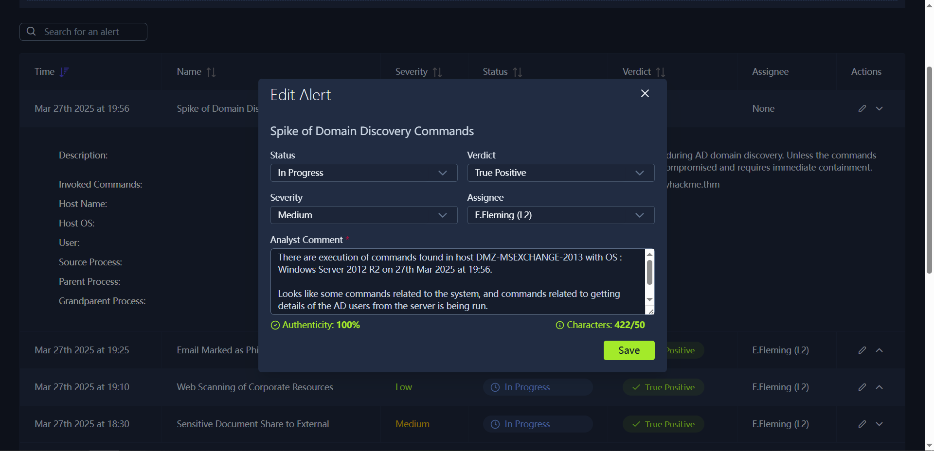 初始步骤旨在确保您负责处理分配的警报,避免干扰其他分析师正在处理的警报,并确认您已做好充分准备进行详细调查。具体操作方法是:首先将警报分配给自己,将其状态更改为“进行中”,然后熟悉警报详情,例如警报名称、描述和关键指标。