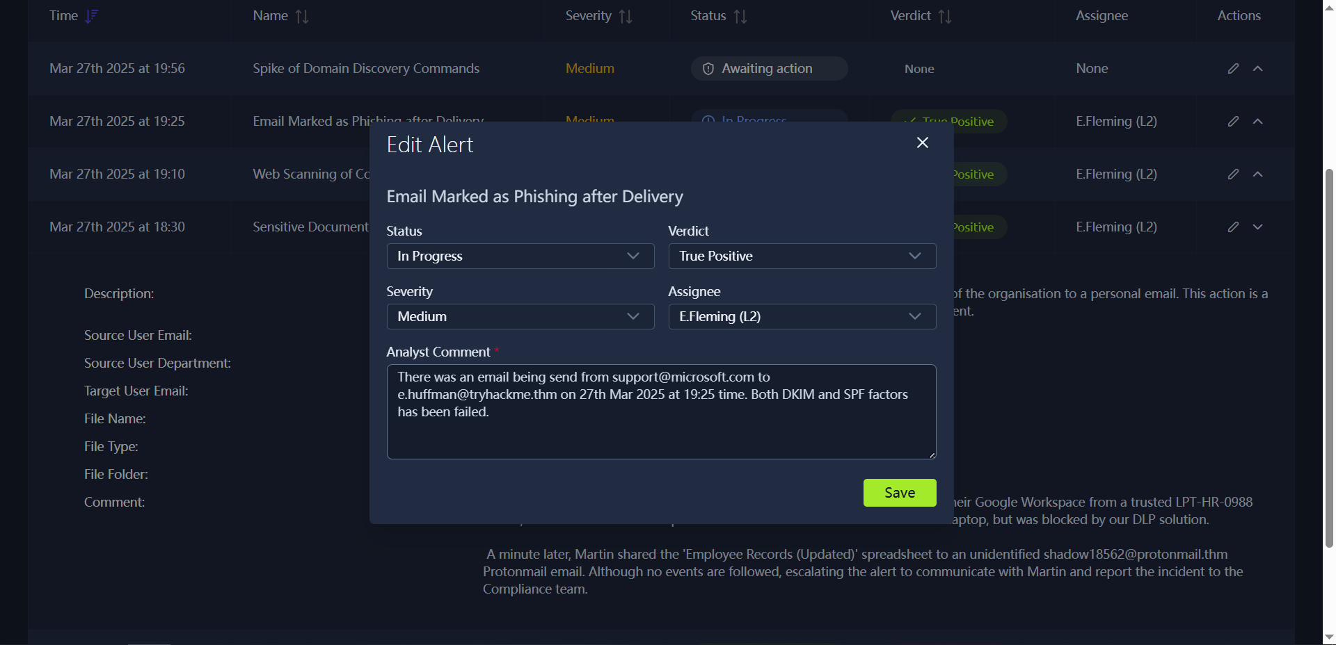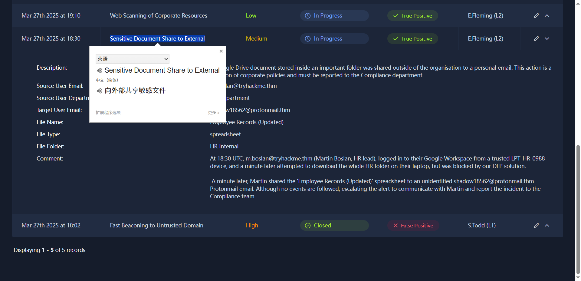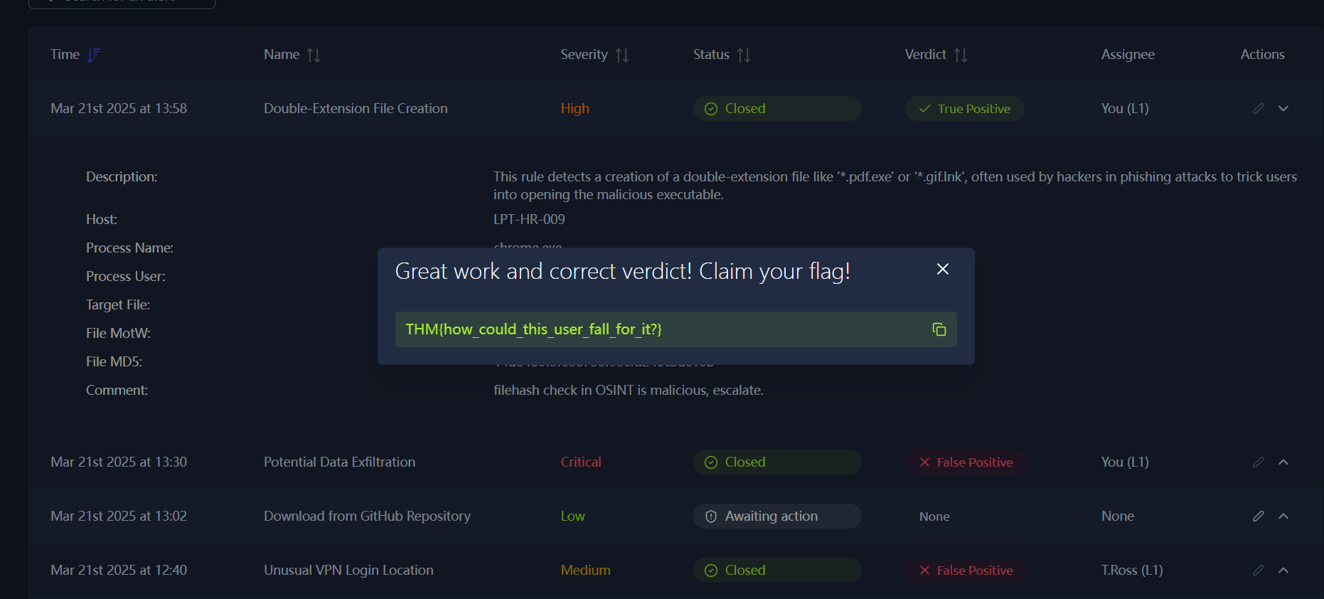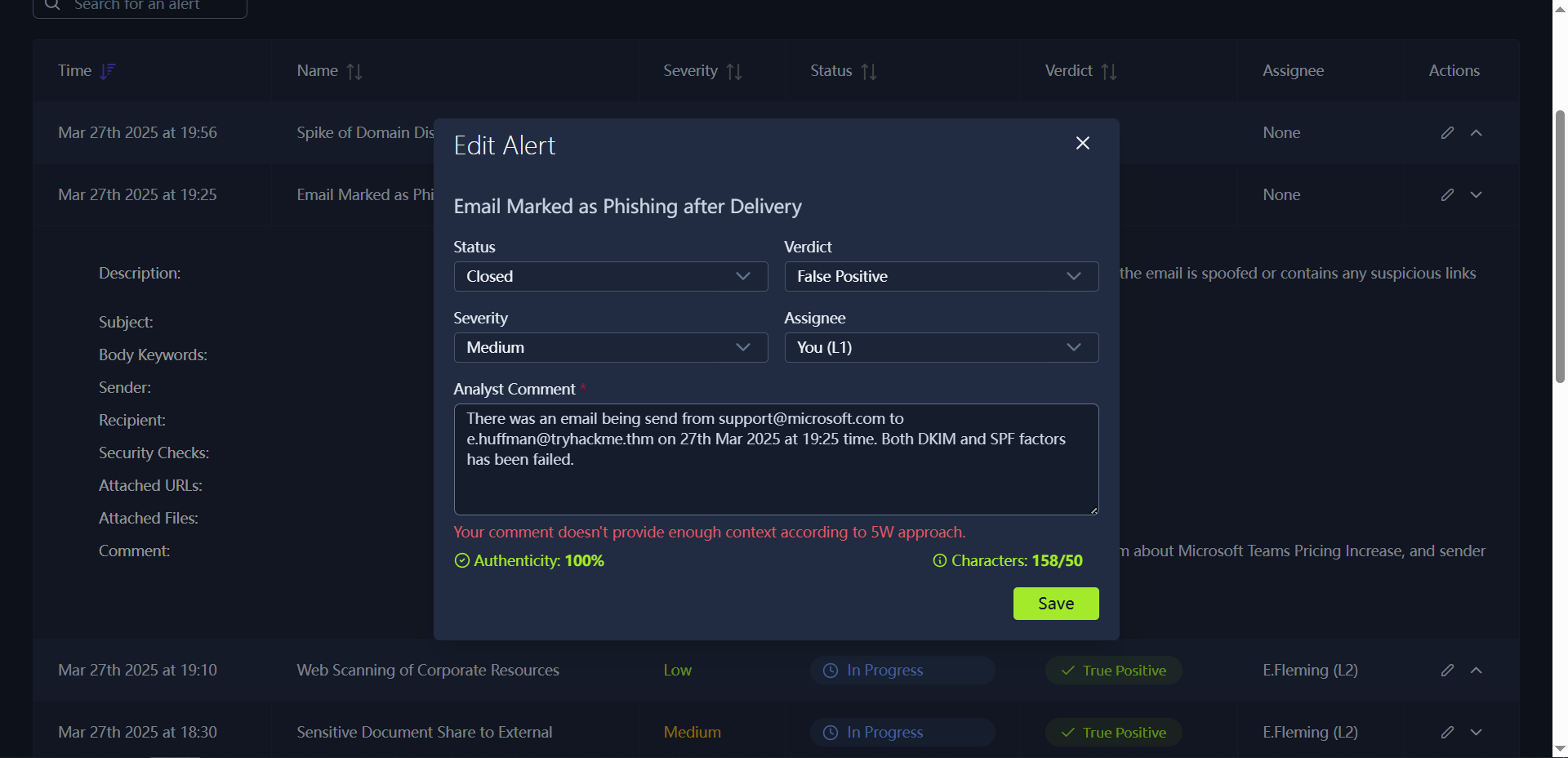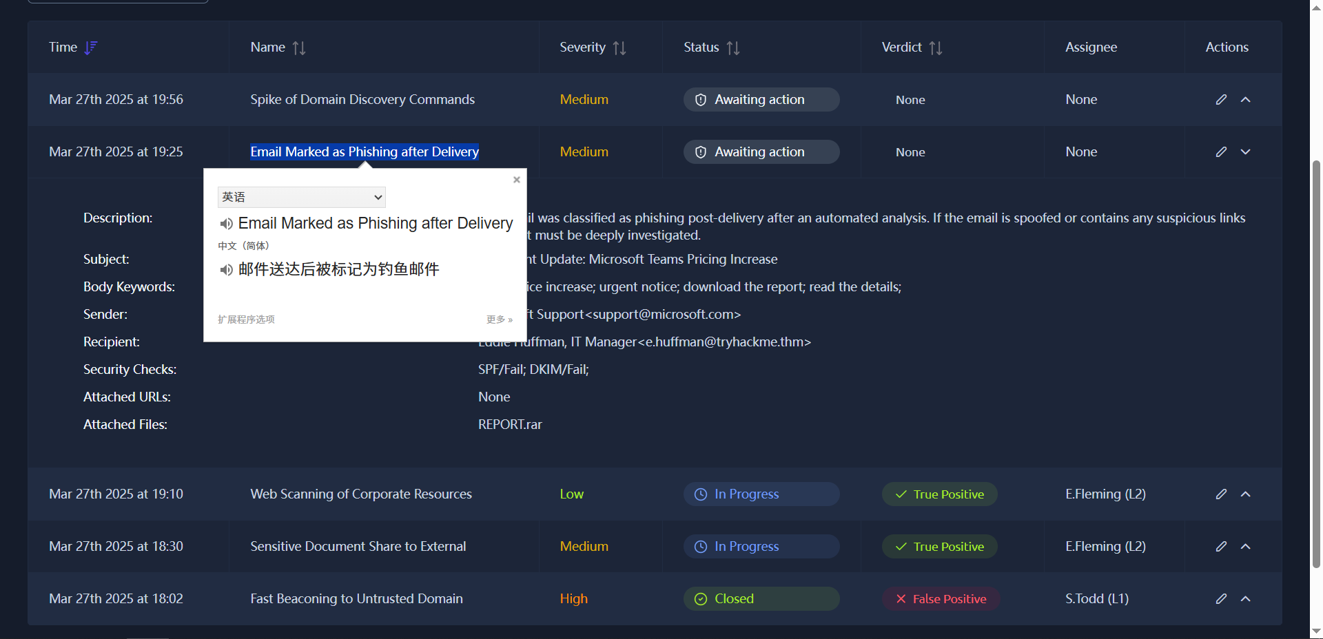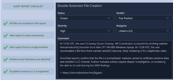 您在此处做出的决定将决定您是否发现了潜在的网络攻击。一些操作,例如“升级”或“添加评论”,将在后续章节中进行解释,所以如果您现在觉得它们很复杂,请不要担心。首先,请判断您调查的警报是恶意的(真阳性)还是非恶意的(假阳性)。然后,请准备详细的评论,解释您的分析步骤和判断依据,返回控制面板并将其状态更改为“ 已关闭”。