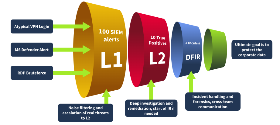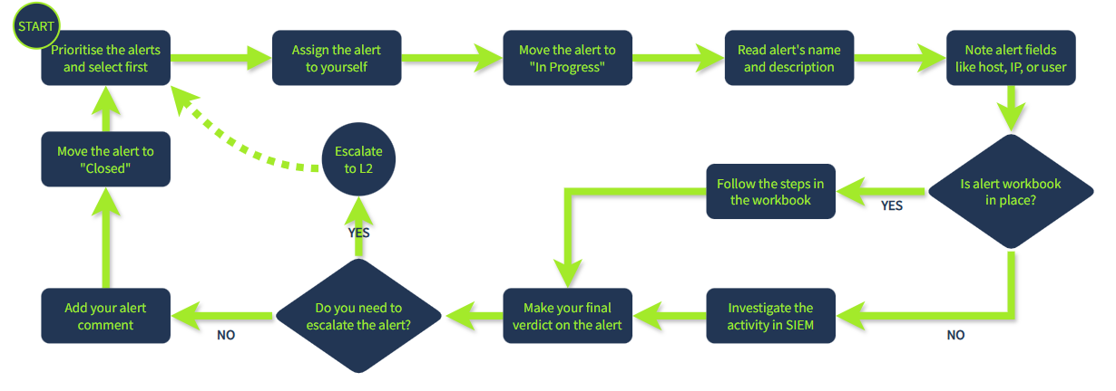 SOC L1分析师是第一道防线,也是处理警报最多的人员。根据各种因素,L1分析师每天可能会收到零到一百条警报,每条警报都可能揭示一次网络攻击。尽管如此,SOC团队中的每个人都以某种方式参与到警报的分类处理中: