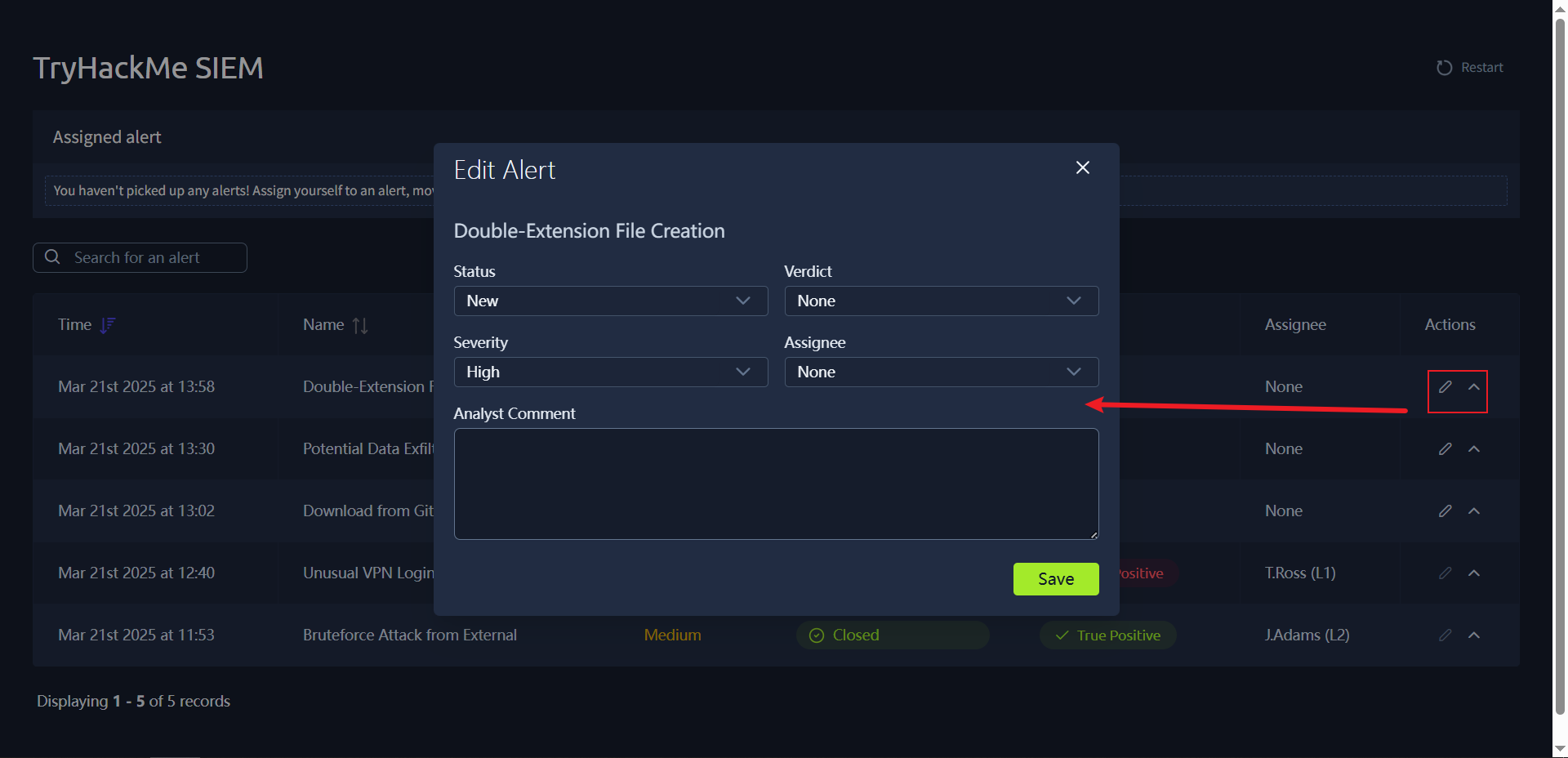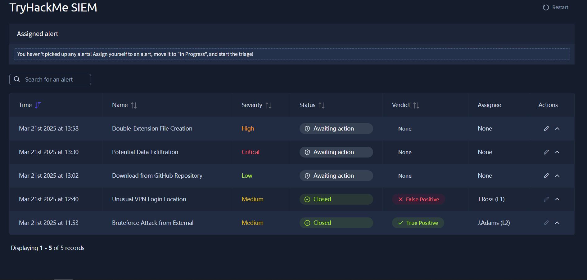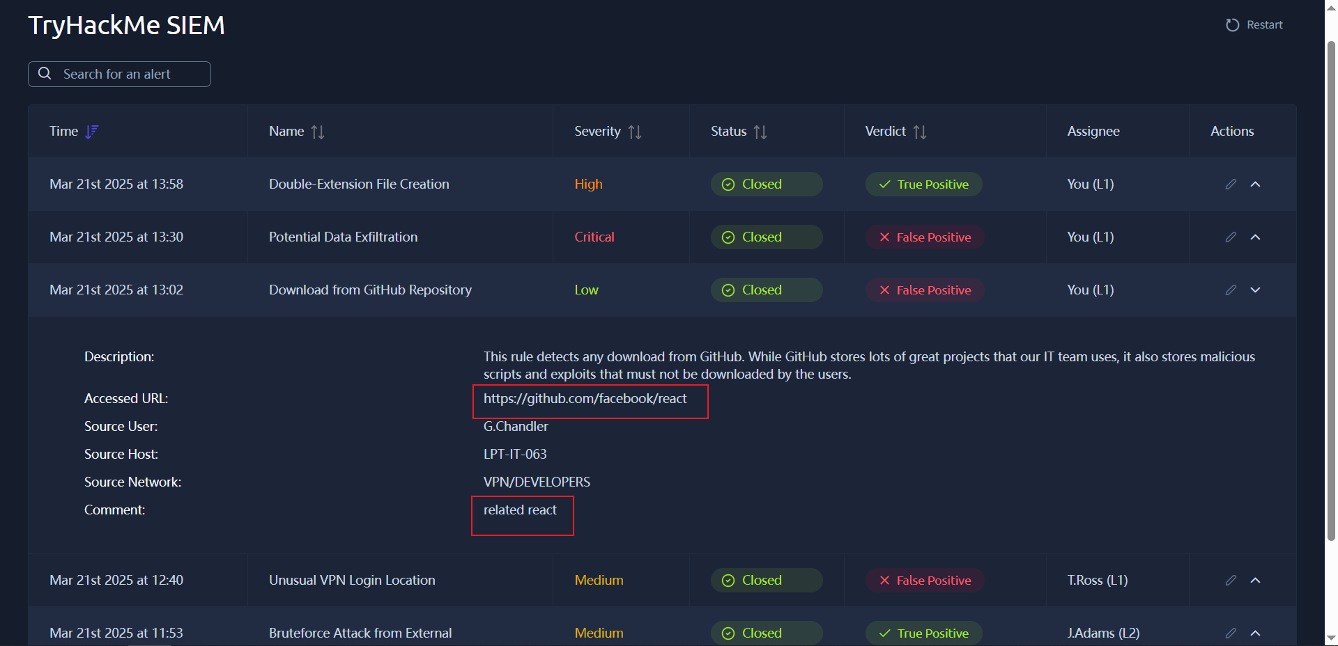 您可以通过点击 TryHackMe SIEM右上角的“重启”按钮来重置SOC控制面板。