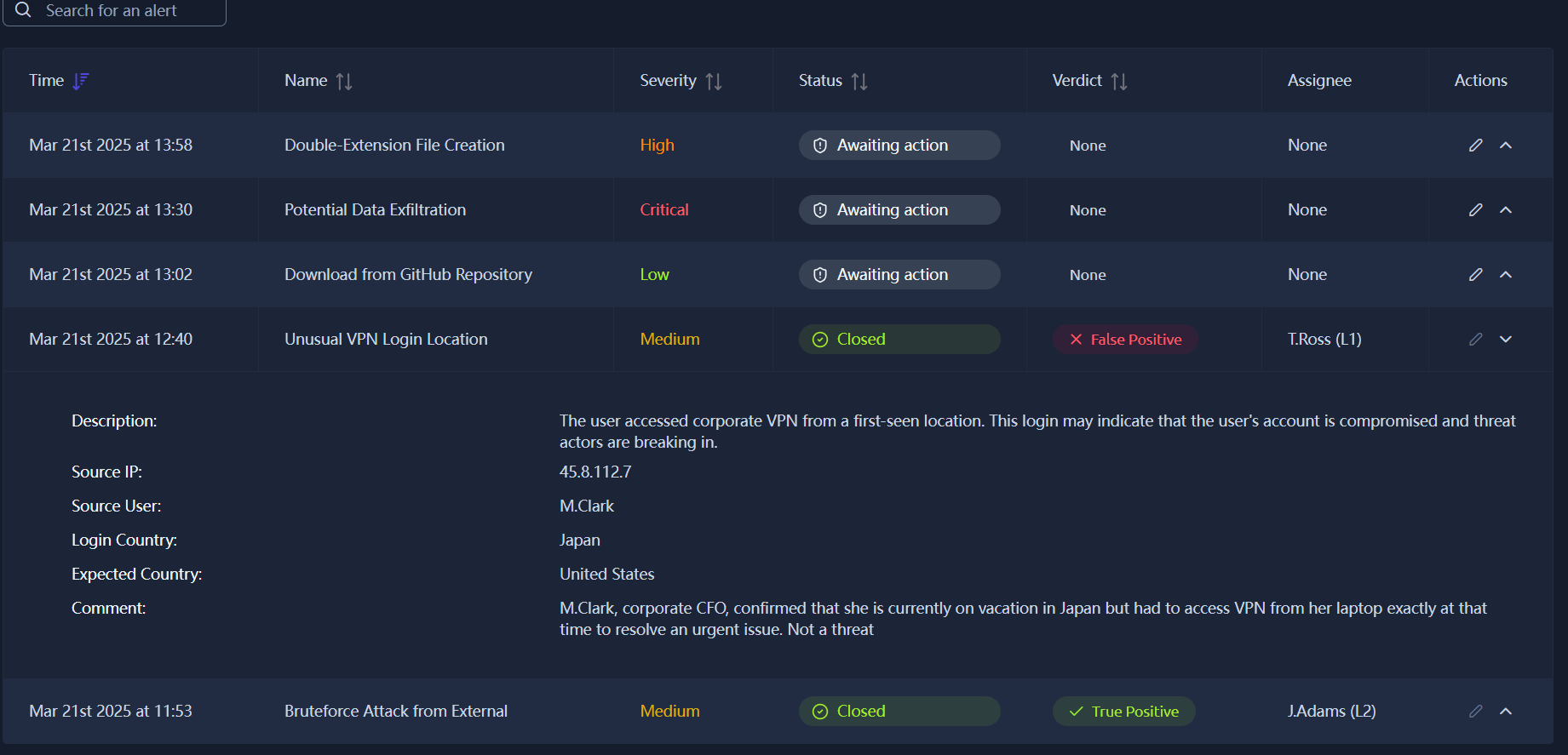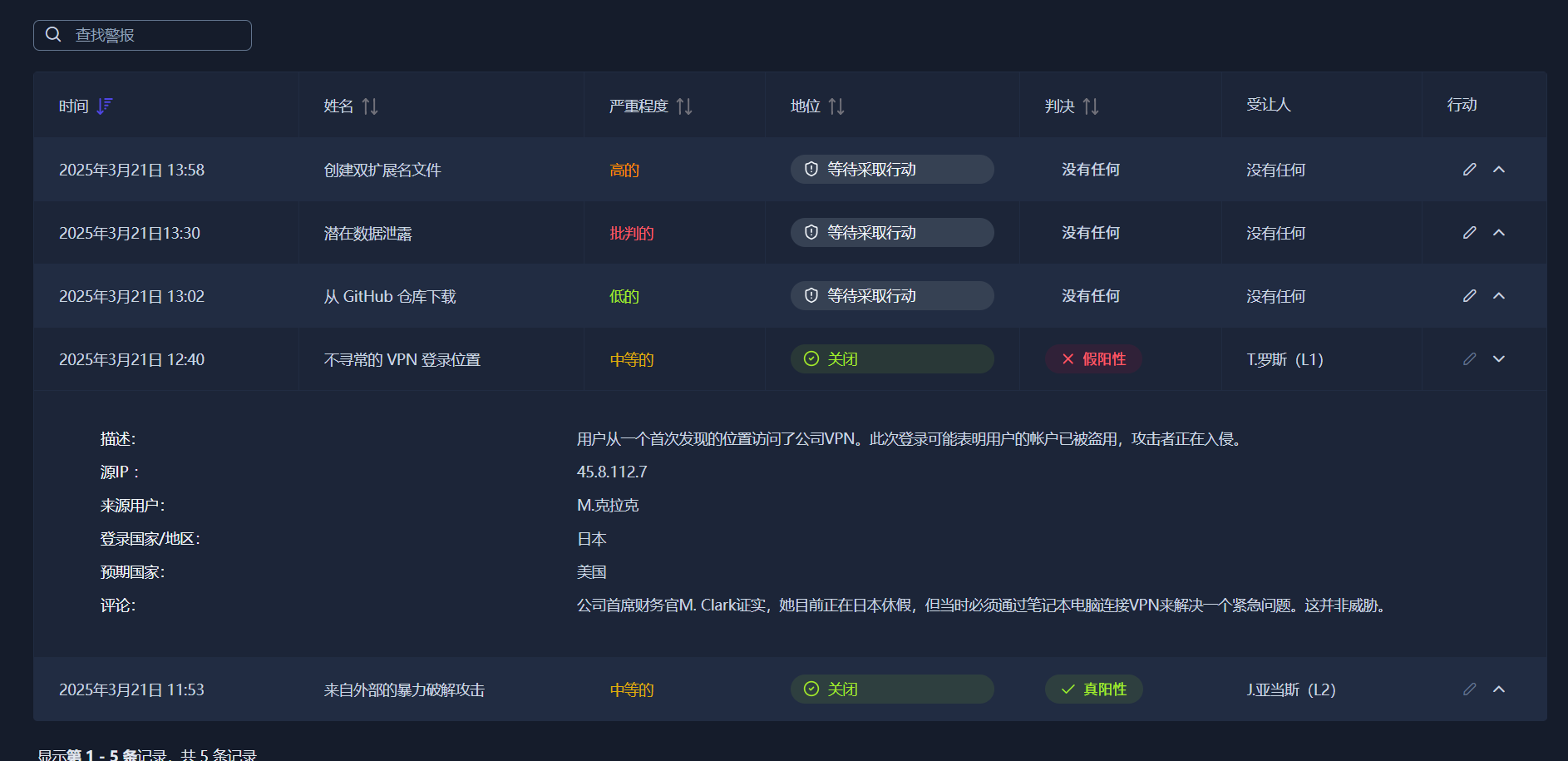| 2 | 警报名称 | 根据检测规则的名称,提供事件概要。 | - 异常登录位置 - 标记为钓鱼邮件 - Windows RDP暴力破解 - 潜在数据泄露 |
