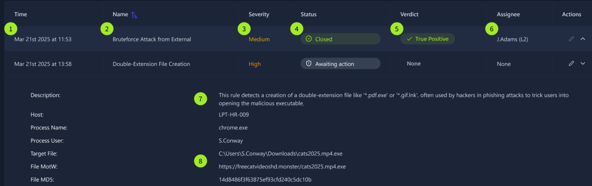 | 6 | 警觉受让人 | 显示被指派或自行指派审核警报的分析师。 | - 受让人有时也可被称为有意识的所有者 - 受让人对其发出的警报负责。 |