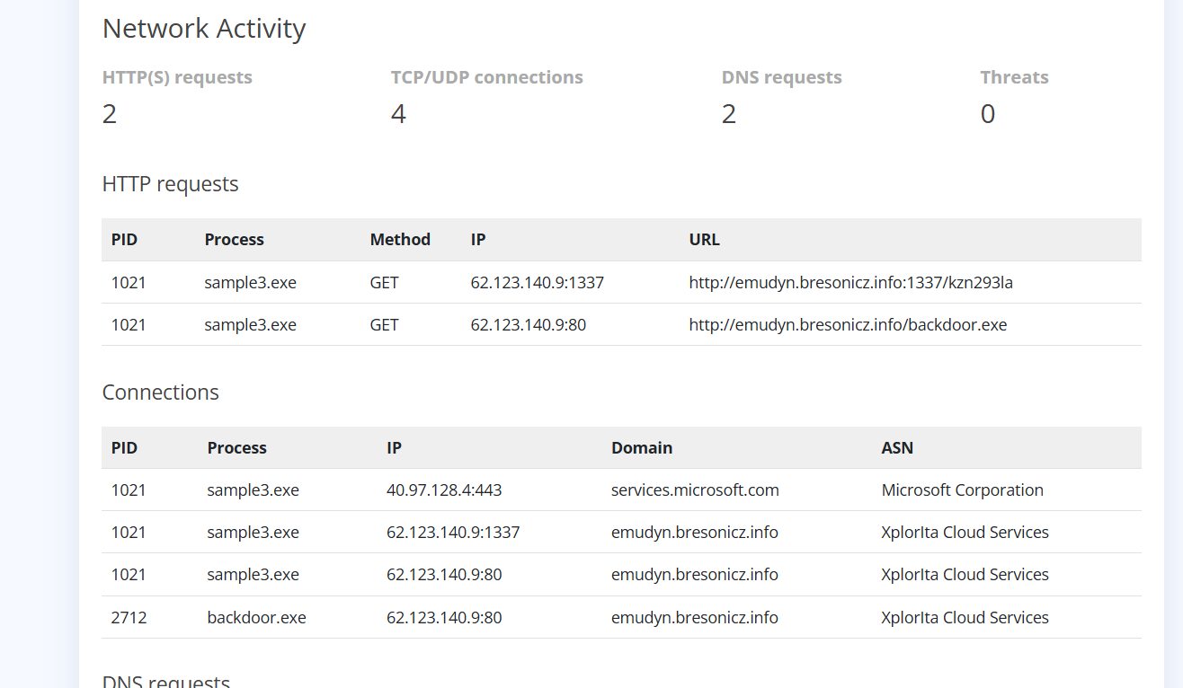 此选项卡显示自样本爆炸以来发出的DNS请求。恶意软件经常发出DNS请求来检查互联网连接(例如,如果它无法连接到互联网/回拨,则可能是被沙盒化了或已失效)。