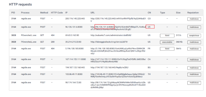 名为regidle.exe 的进程向位于美国的 IP 地址(端口 8080 )发出 POST 请求。该 IP 地址是什么?