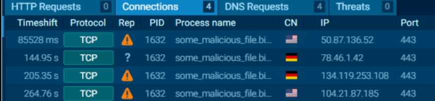 此选项卡显示自样本爆发以来进行的所有通信。这有助于查看某个进程是否与其他主机进行通信。例如,这可能是C2流量、通过FTP上传/下载文件等。