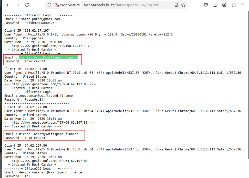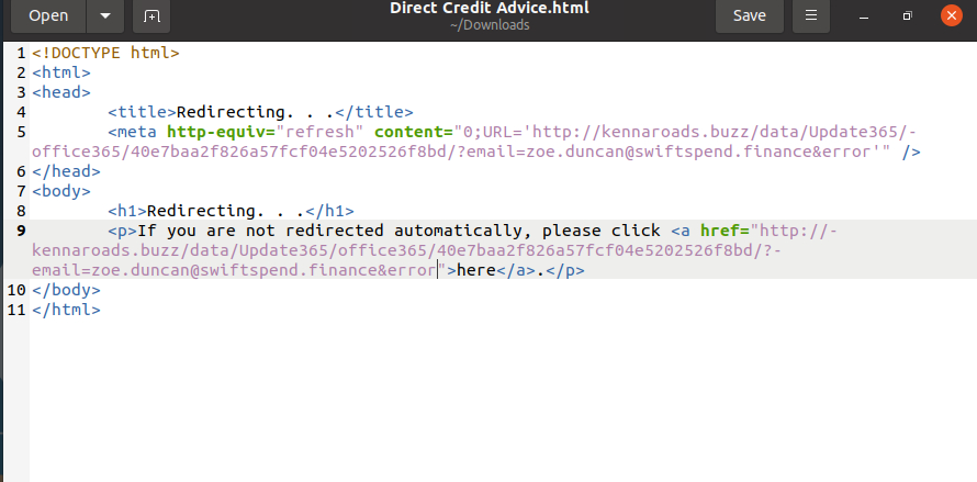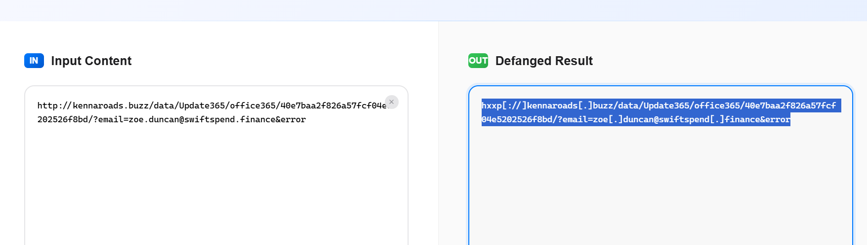 hxxp[://]kennaroads[.]buzz/data/Update365/office365/40e7baa2f826a57fcf04e5202526f8bd/?email=zoe[.]duncan@swiftspend[.]finance&error