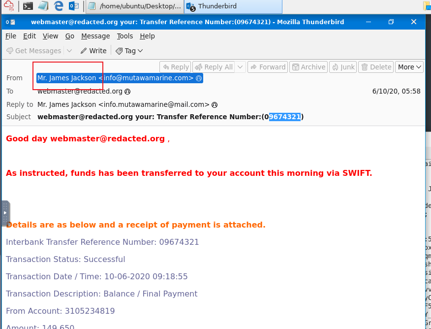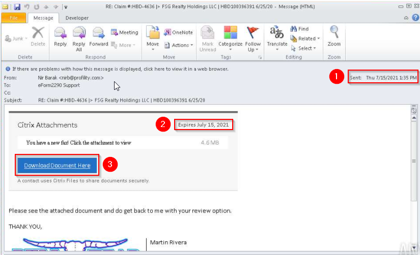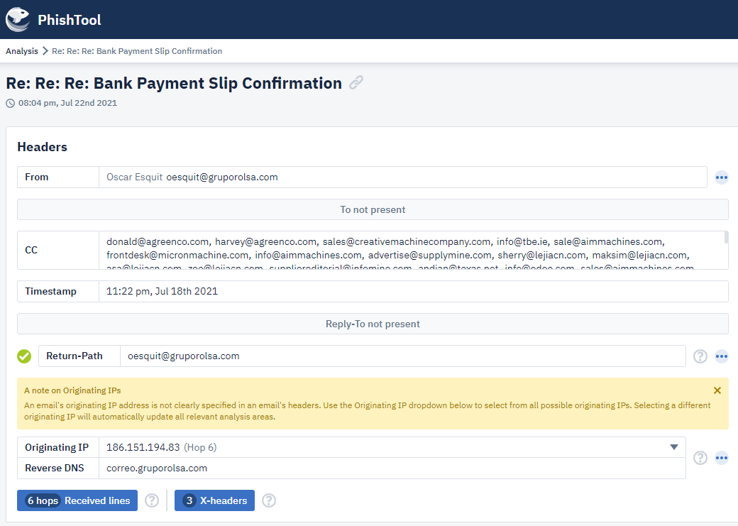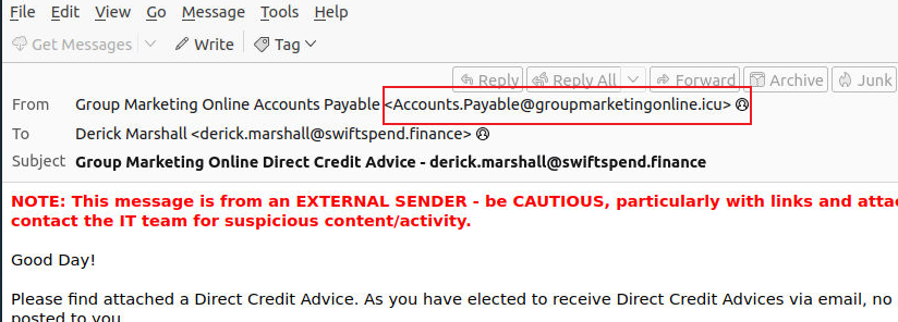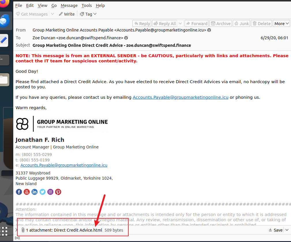 Greenholt PLC的一位销售主管收到了一封他意料之外的客户邮件。他表示,这位客户从不使用“您好”之类的通用问候语,而且他从未期望收到任何转账。 邮件中还包含一个他从未要求过的附件。他已将邮件转发给安全运营中心 ( SOC ) 部门进行进一步调查。