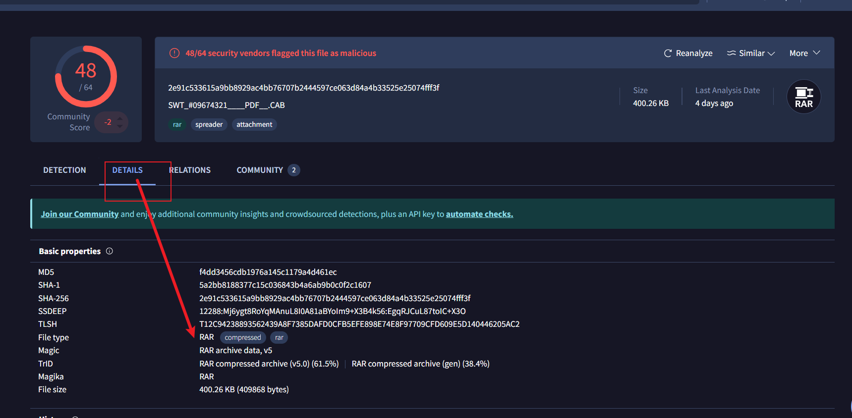 这里问的是这个恶意文件在OSINT上首次提交的时间,我们将hash值传到virustotal上,那个时间一般情况就是首次提交时间了