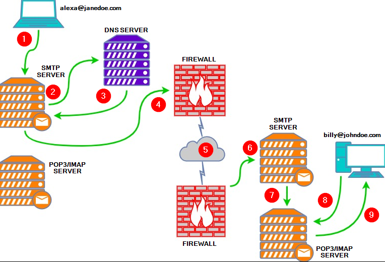 - Alexa 的电子邮件已转发,现在正存储在本地POP3 / IMAP服务器上,等待 Billy 的接收。