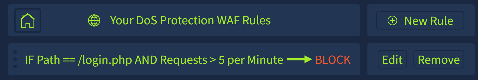 例如,您可以实施一条限速防火墙规则,将请求次数限制为/login.php每分钟五次。如果发起请求的 IP 地址请求页面超过五次,则会在一段时间内阻止其再次发起请求,或者要求其进行验证以证明该请求是人类发起的。