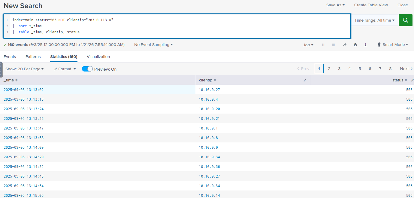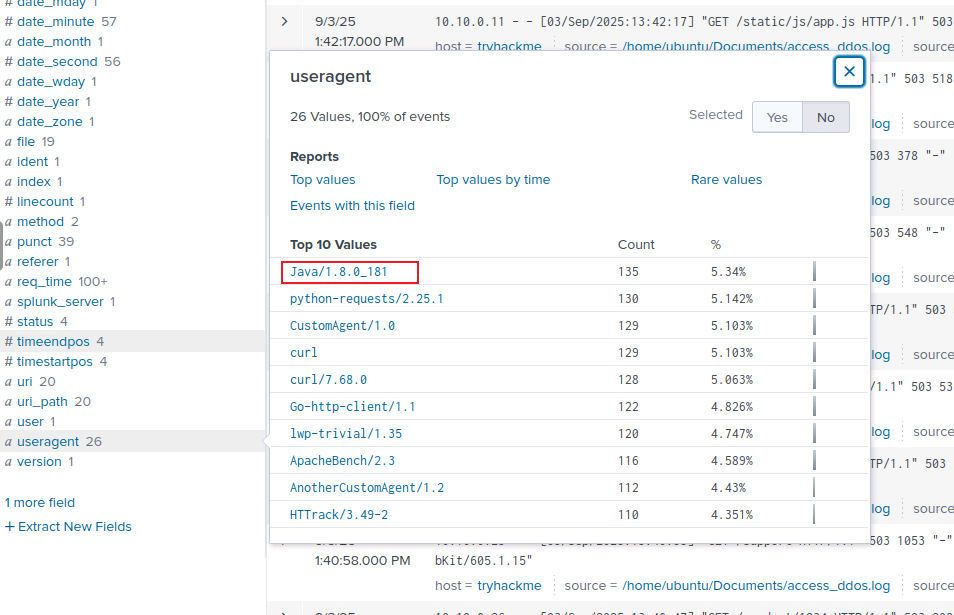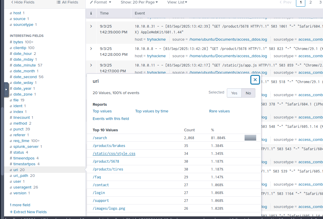在本练习中,您将分析在疑似攻击期间收集的 Web 访问日志。这些日志包含正常用户流量和潜在恶意请求的混合数据。首先,打开Splunk中的 “搜索与报告” 应用,并在主索引中运行搜索。在图形用户界面 (GUI)的左侧,您将看到从日志文件中提取的字段。这些字段在您的调查过程中将非常有用。index="main"