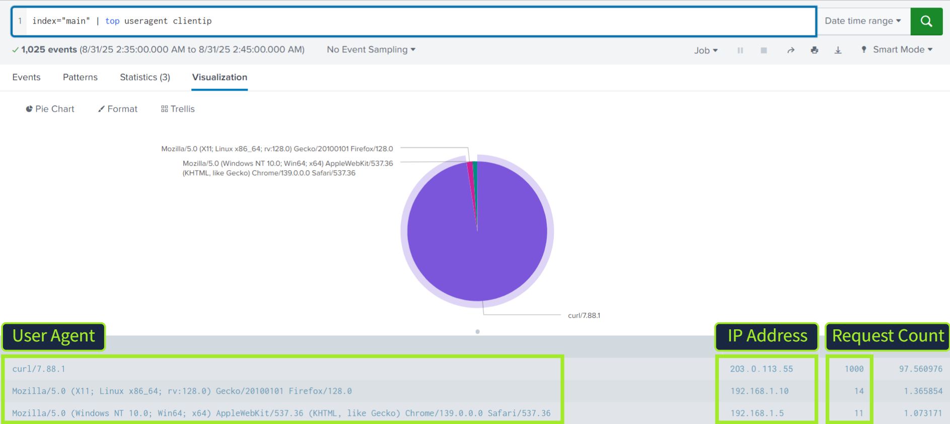 通过查看相同的请求,但按用户代理(useragent)和 IP 地址(clientip)字段进行筛选,您可以查看有关请求来源的更多详细信息。