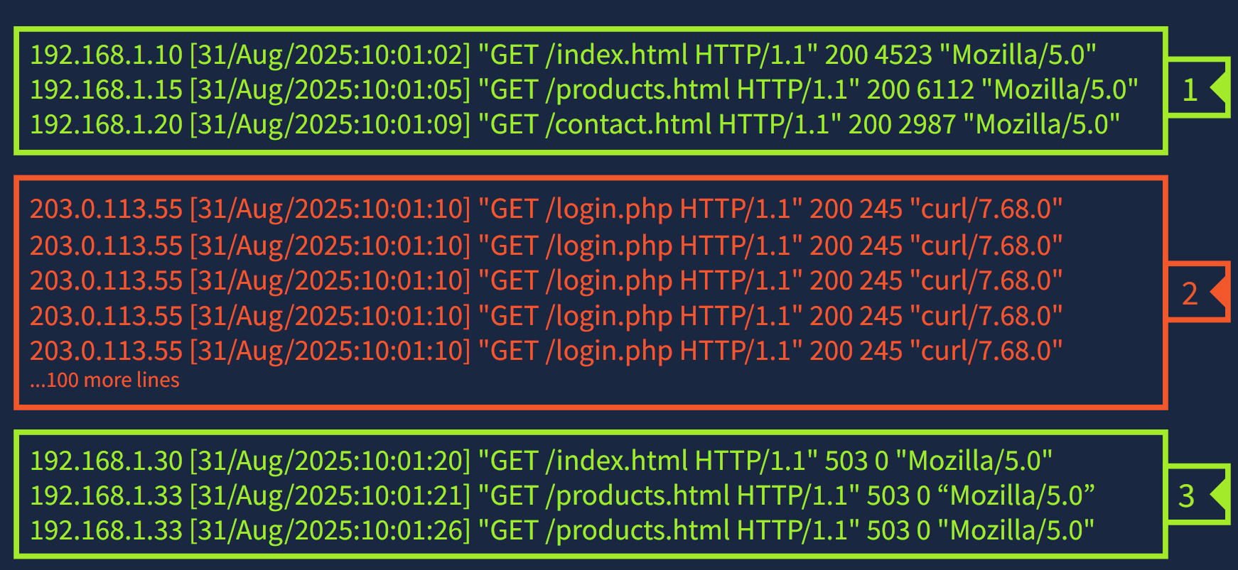 | 高请求率 | 10.10.10.100→ 1000GET /login |