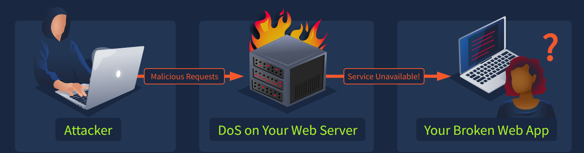当您访问网站时,您的浏览器会向网络服务器发送请求。服务器处理该请求,验证访问权限,并向用户返回响应。该响应可以是网页、图像,也可以是搜索结果或您的帐户信息等数据。这种请求-响应循环是网络运行的基础。攻击者可以通过向服务器发送大量请求、绕过访问控制,甚至诱骗服务器执行恶意命令来滥用此请求-响应循环。