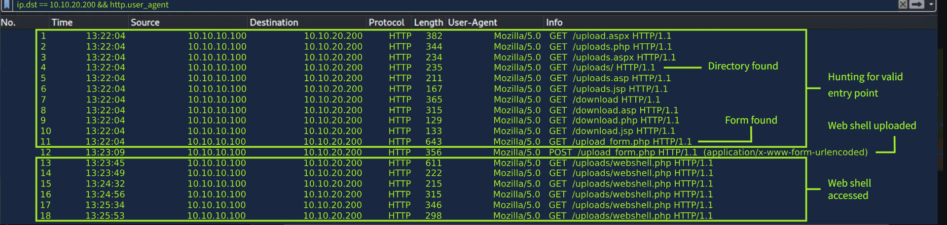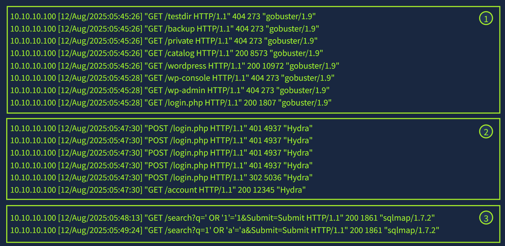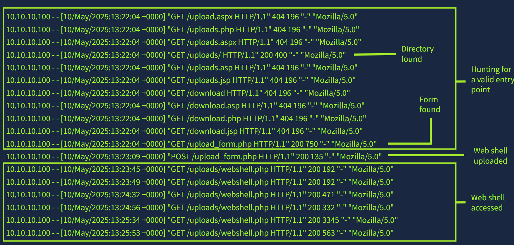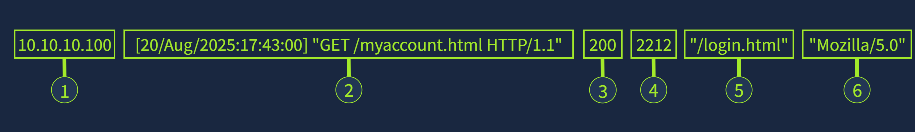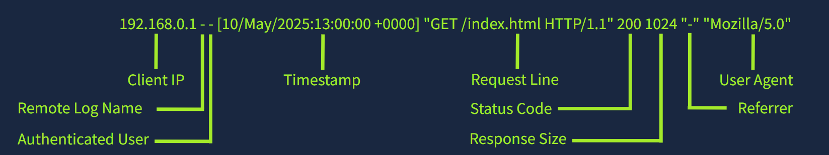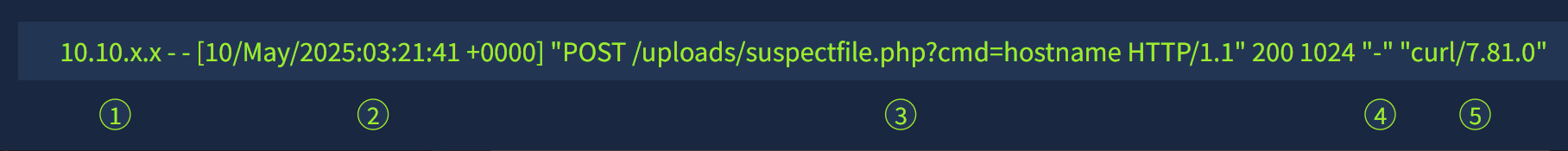 Web 服务器可以为收到的每个请求创建日志。我们称这些日志为访问日志,它们在安全方面极其重要,因为它们会跟踪与服务器的每次交互信息,包括客户端的 IP 地址、时间戳、请求的页面或数据、服务器的响应状态以及用户代理。这些字段在调查中发挥着重要作用,可以帮助分析人员检测潜在的恶意活动并追踪攻击者的行为。