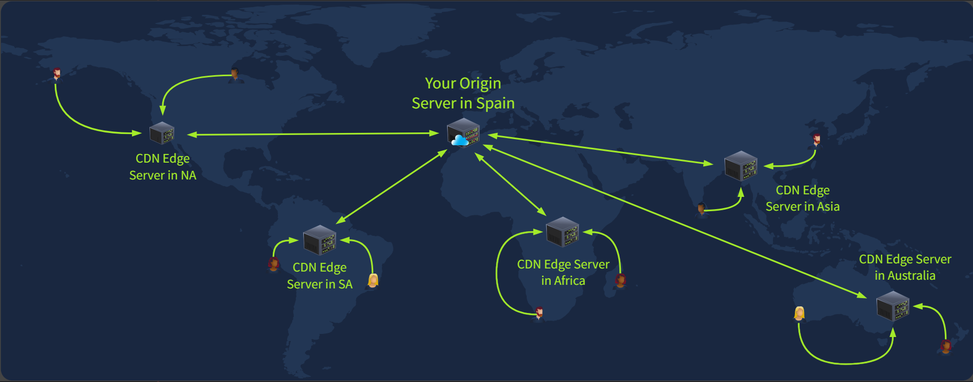 CDN将缓存内容存储在距离用户更近的服务器上,并通过这些服务器提供缓存内容,从而降低延迟。想象一下,您有一个位于中心位置的主服务器。该主服务器向全球各地的边缘服务器提供信息,以便您的客户能够更快、更安全地访问数据。除了速度之外,CDN 还能在安全性方面发挥作用,它充当用户和源服务器之间的缓冲区。