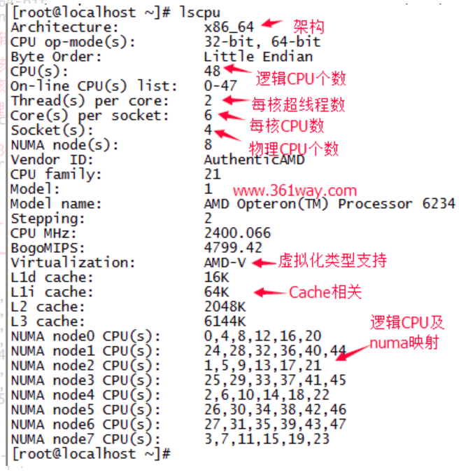 命令输出的信息包含cpu数量,线程,核数,套接字和Nom-Uniform Memeor Access(NUMA),缓存等