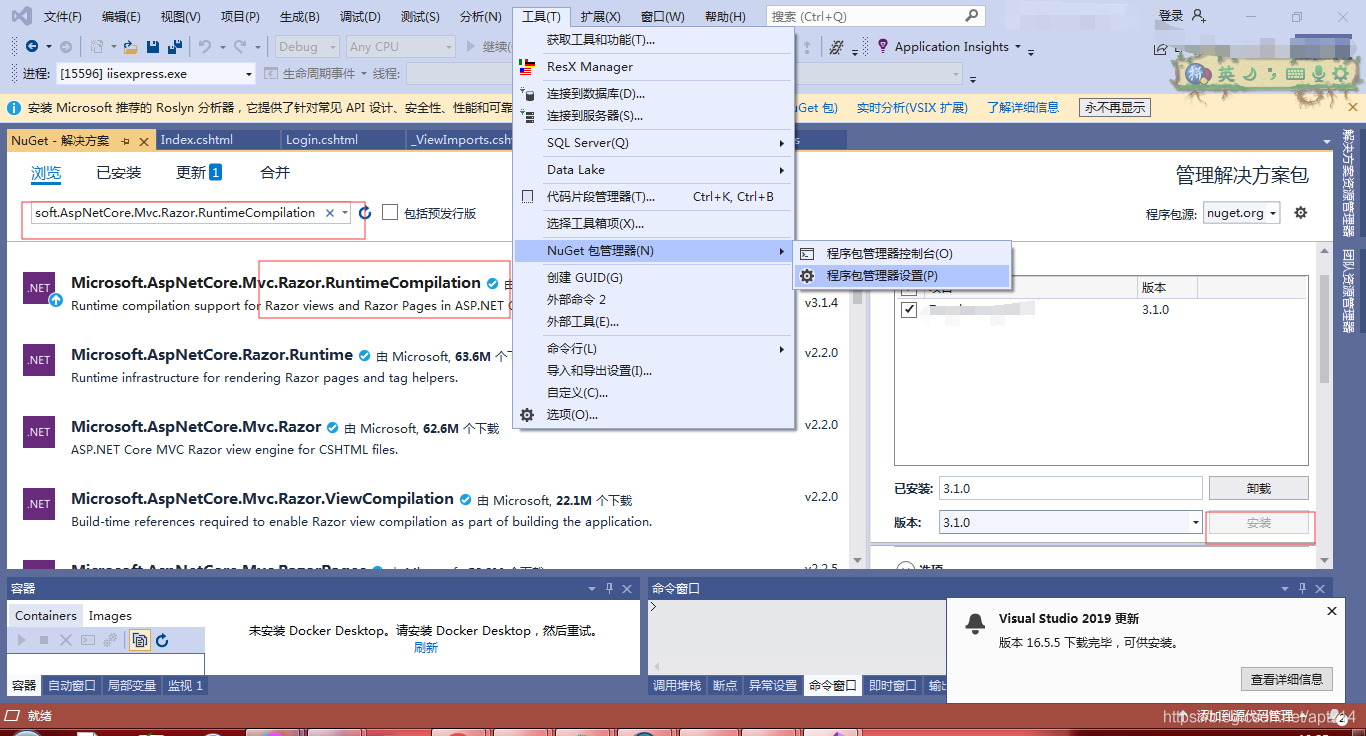 打开顶部菜单-----工具--NuGet包管理器---浏览----搜索 Microsoft.AspNetCore.Mvc.Razor.RuntimeCompilation