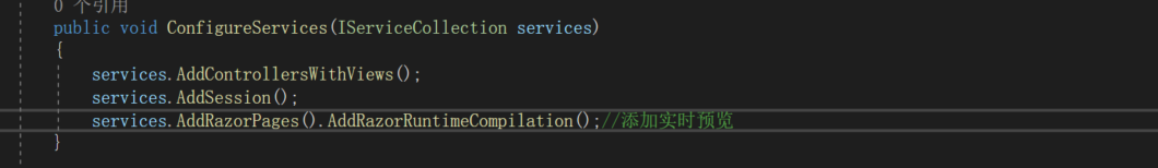 然后再startup.cs里面的ConfigureServices下添加 services.AddRazorPages().AddRazorRuntimeCompilation();//添加实时预览