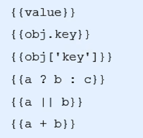 在{{}}语法中、可以进行变量的输出、对象属性的输出、三元表达式输出、逻辑或输出、加减乘除等表达式输出