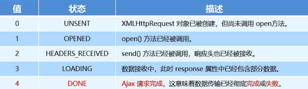XMLHttpRequest对象的readyState属性、用来表示当前Ajax请求所处的状态。每个Ajax请求必然处于以下状态中的一个: